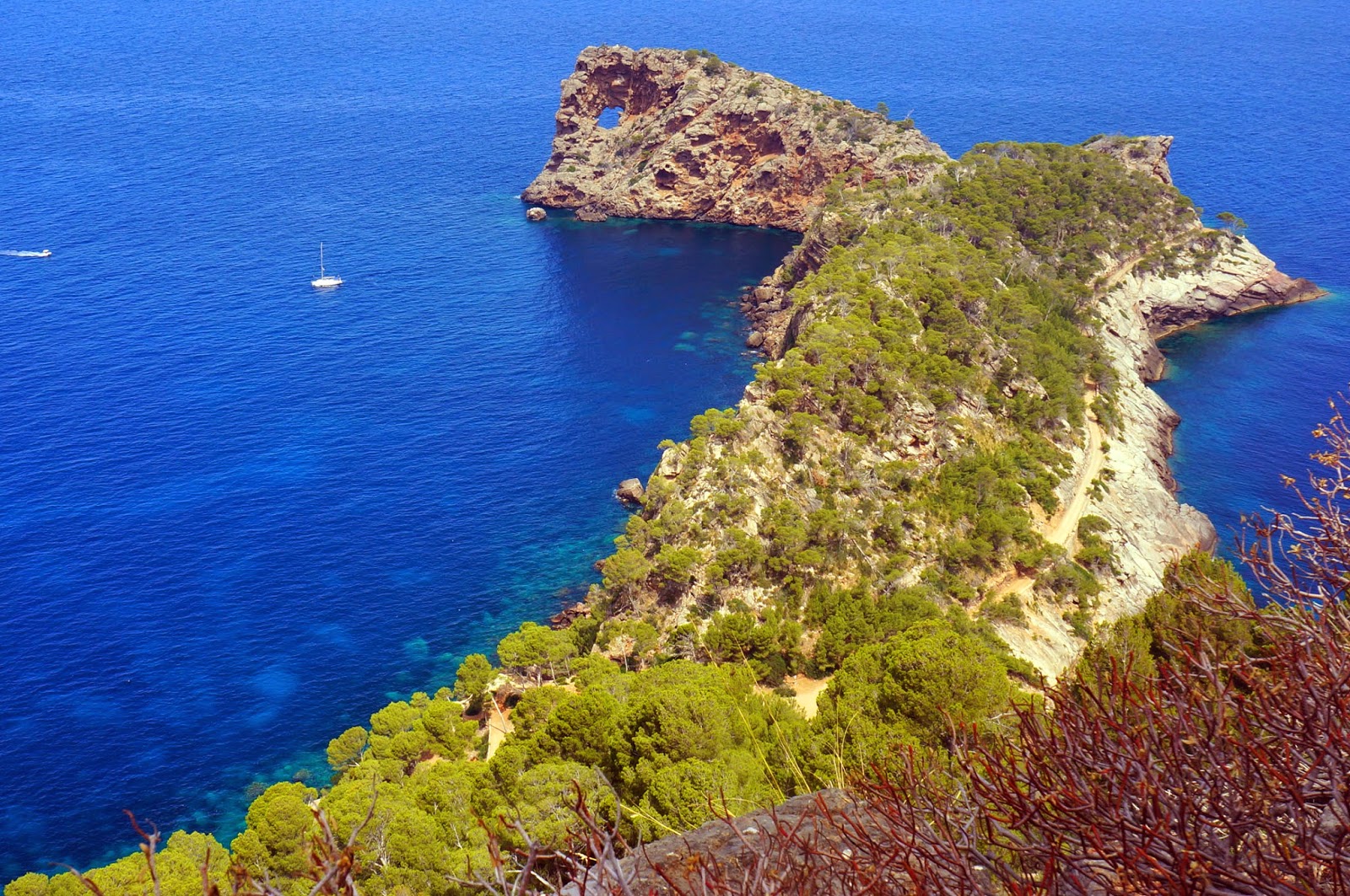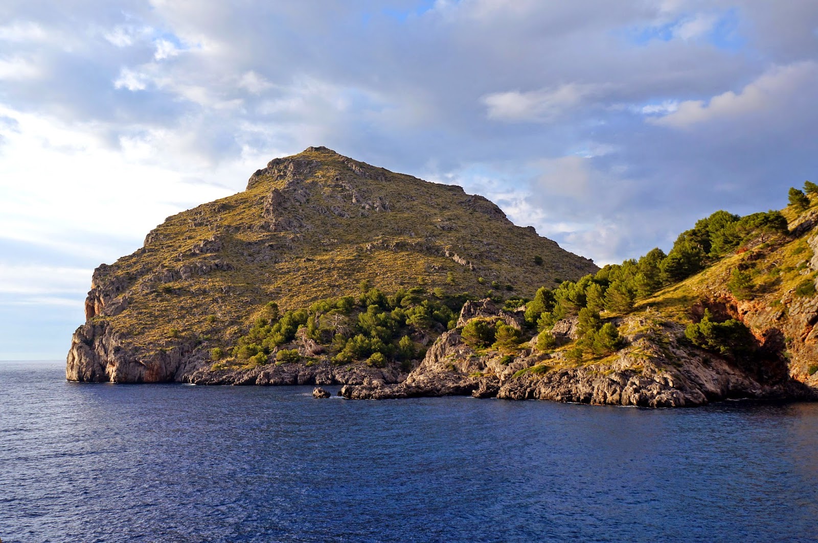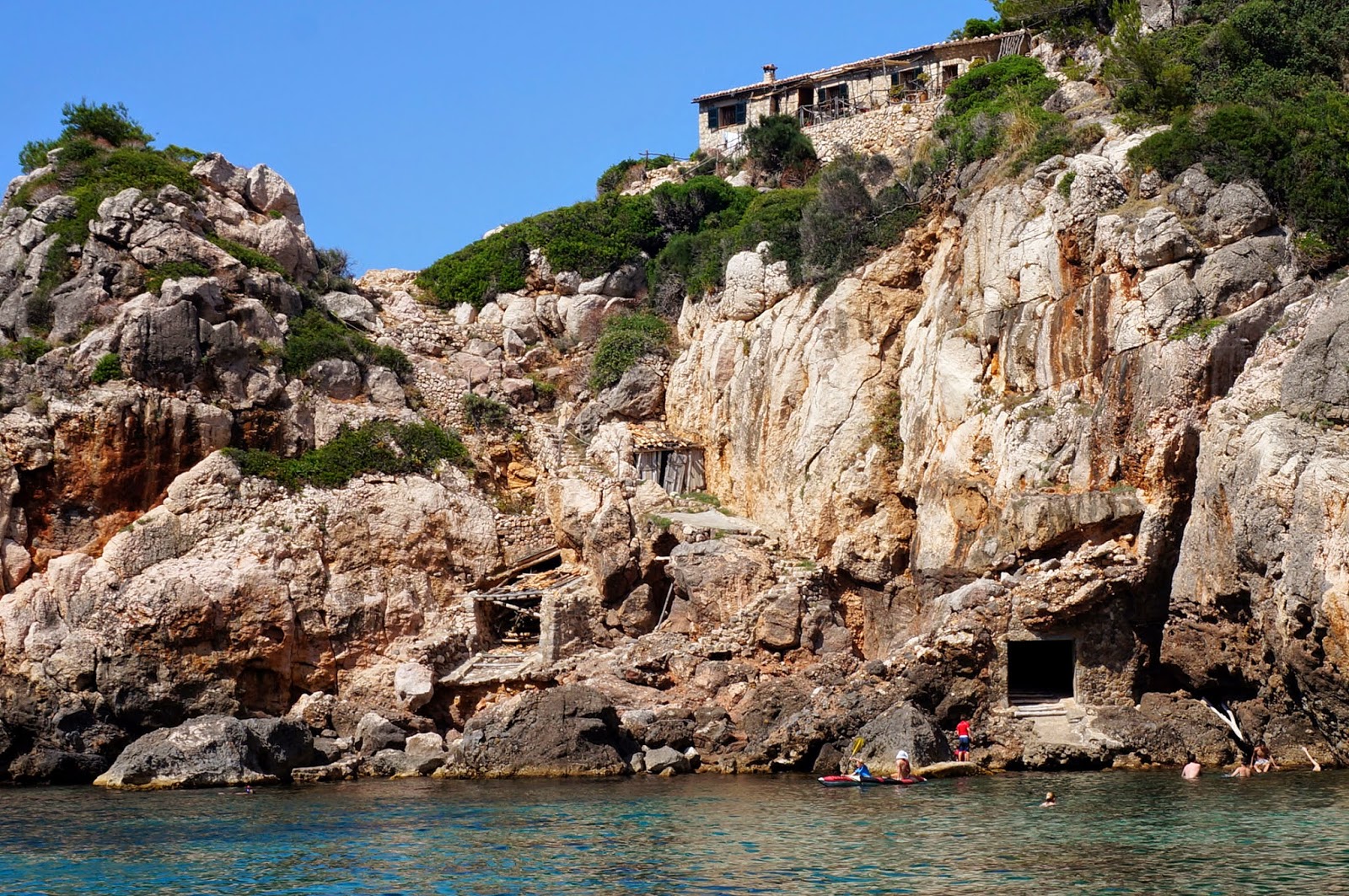Bajando el camino hacia la península que puede verse desde el mirador Na Foradada, junto a San Marroig. Casi al final de la ruta decidimos meternos en una cala escondida, de piedras, a la que puede accederse tras un árbol que se encuentra a la derecha del camino, justo al final de la cuesta. Para acceder es necesario bajar un barranco de rocas para las cuales es necesario tener algo de físico si se quieren bajar sin mayor problema.